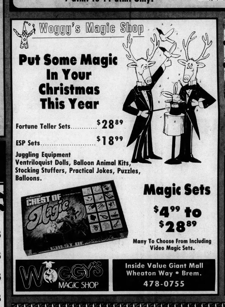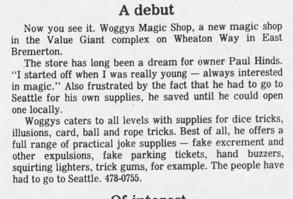 Among my hazy memories of the late-1980s are that a magic shop once resided in the Bremerton Mall, in a weird space between the Value Giant and Albertson’s. This liminal strip contained Helen’s Health Food Store, a popcorn vendor, occasional kiosks and community displays, a line of coin-op kiddie rides in various states of decay, a JK Gill, and a bank. When the bank closed, Woggys appeared, as if by magic.