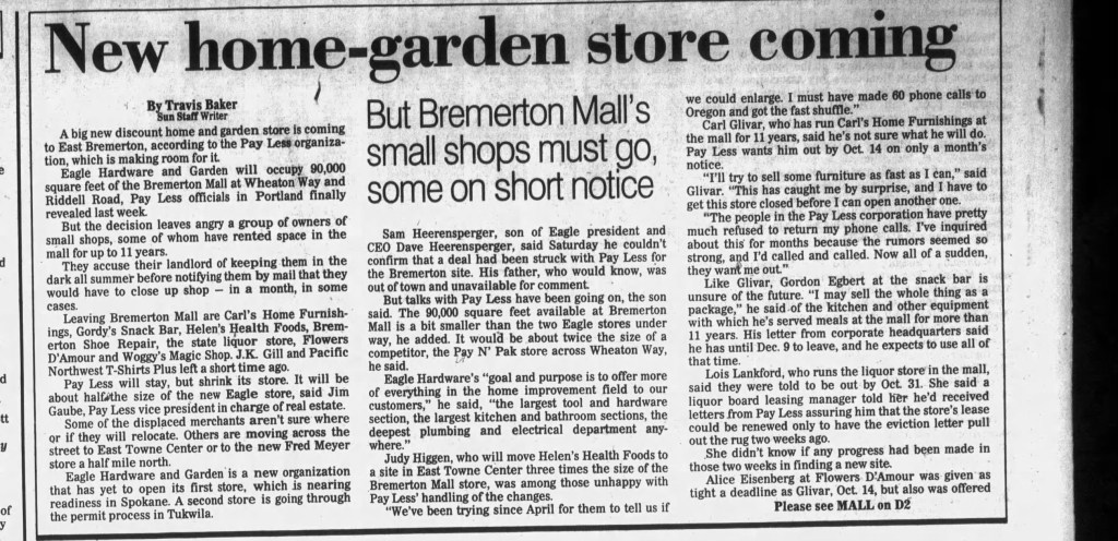 Fascinating though this concept is, Woggys was apparently quite real. It also occupied the space in East Bremerton’s weird mall far longer than I assumed. Woggys did not vacate until ordered to do so by Eagle Hardware, which moved into the shuttered Value Giant space and wanted to expand out into the rest of the “mall.”
